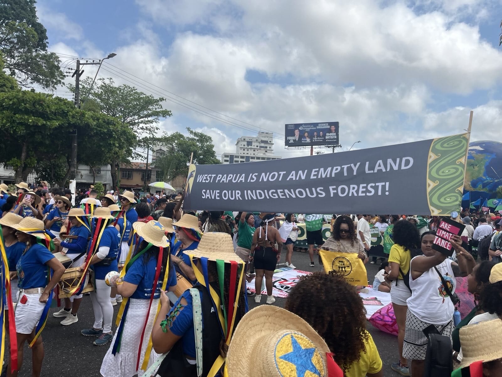 Spanduk bertuliskan: “Papua Barat bukan tanah kosong, selamatkan hutan adat kami!” terbentang di tengah aksi “Great People’s March” di Belém, Brasil, 15 November 2025. (Sumber foto: Koalisi JustCOP)